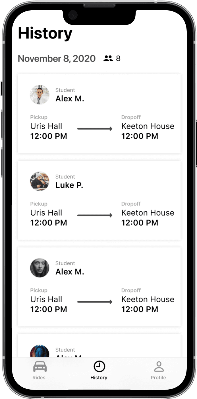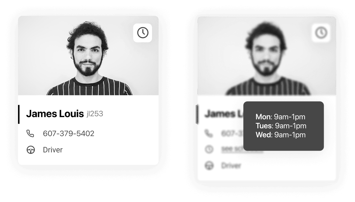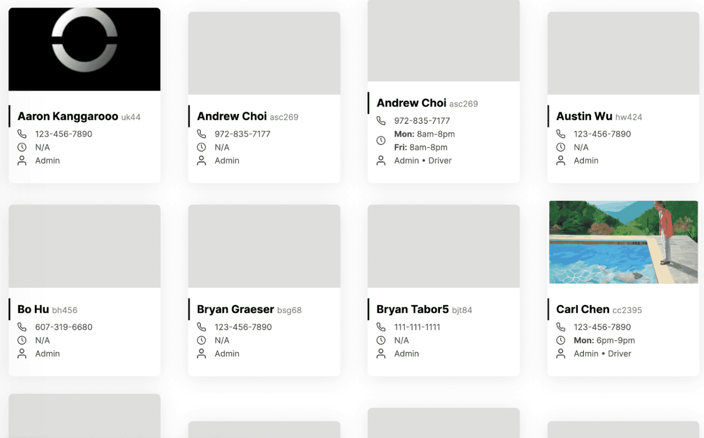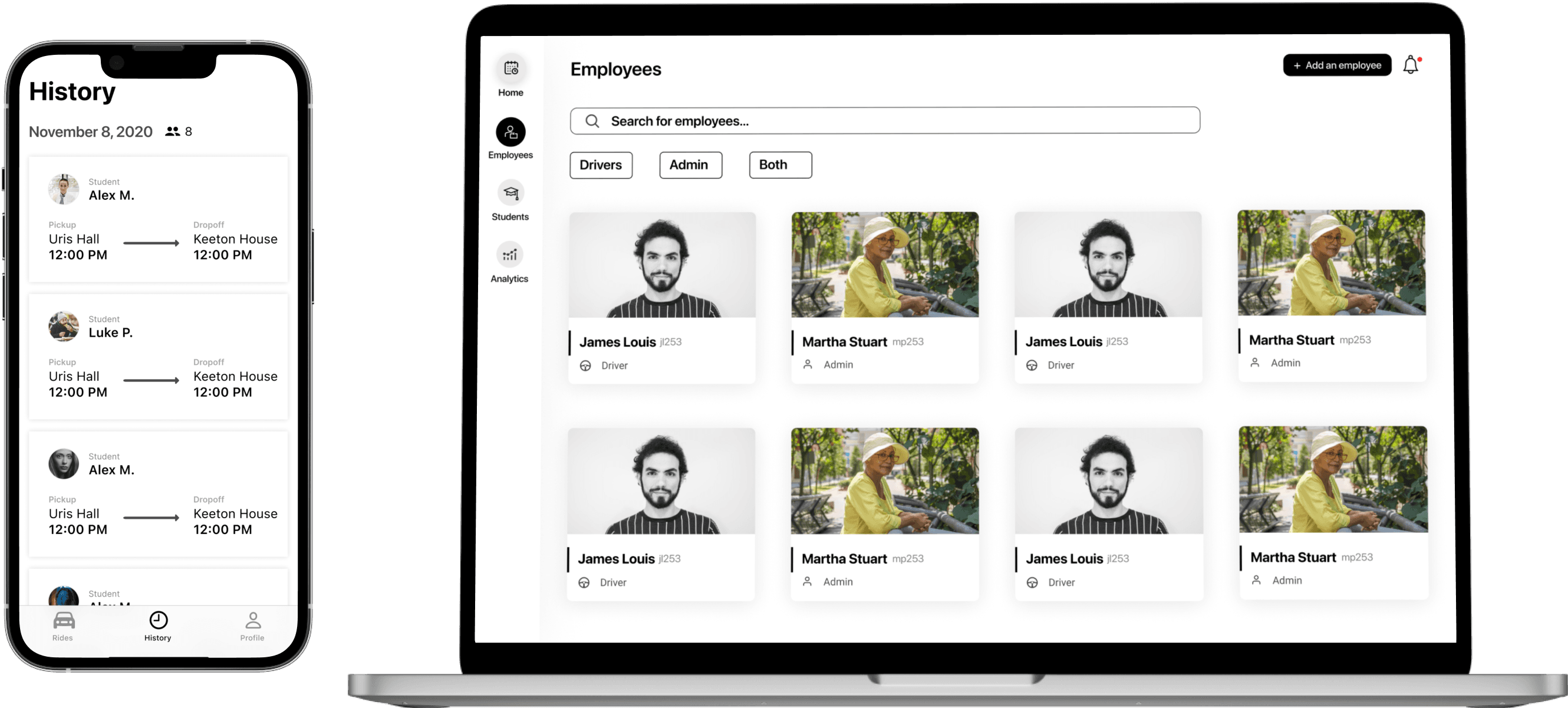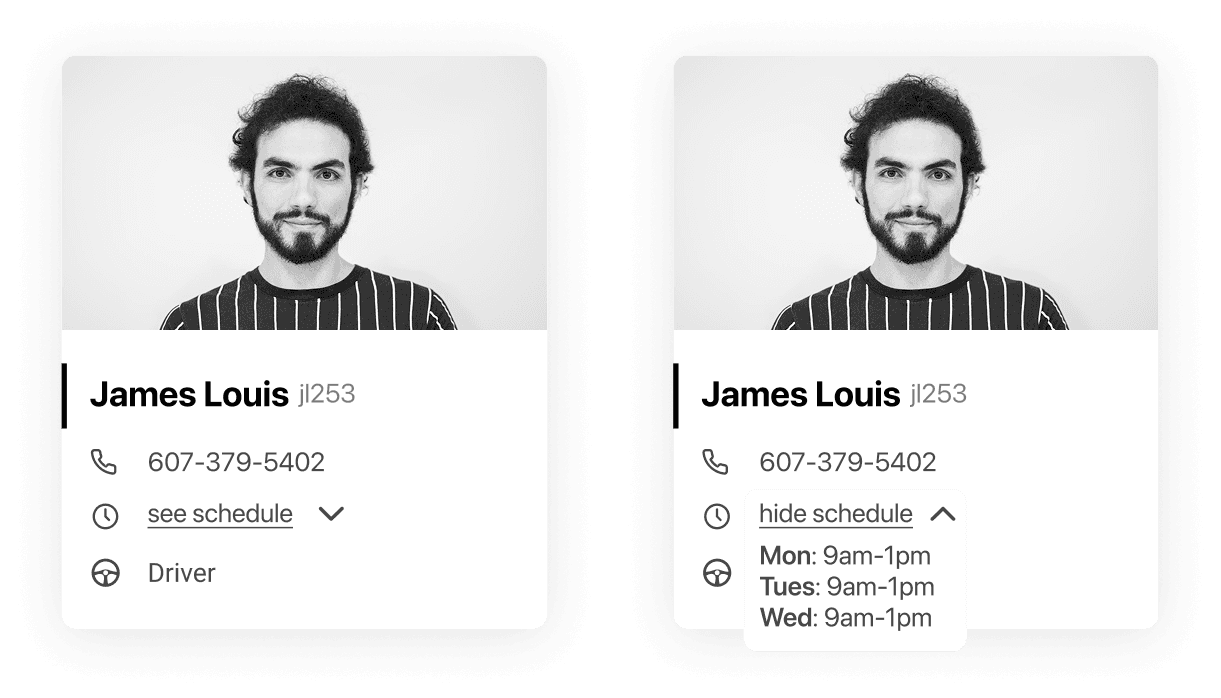 The original admin/driver cards included their schedules which led to an uneven display of employees. This led to confusion as to why some cards were bigger than others. Users wondered if bigger cards meant the employee was more important than another who was displayed with a smaller card,